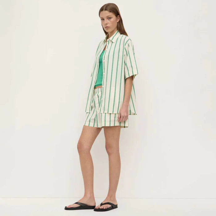 Mid-rise cotton poplin short in a dual stripe design. Features a concealed fly, elasticated waistband and internal waist tie for an adjustable fit. Can be paired with the matching Agnes Stripe Short Sleeve Shirt.