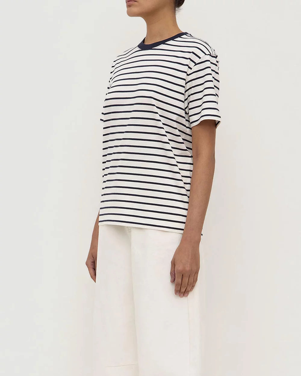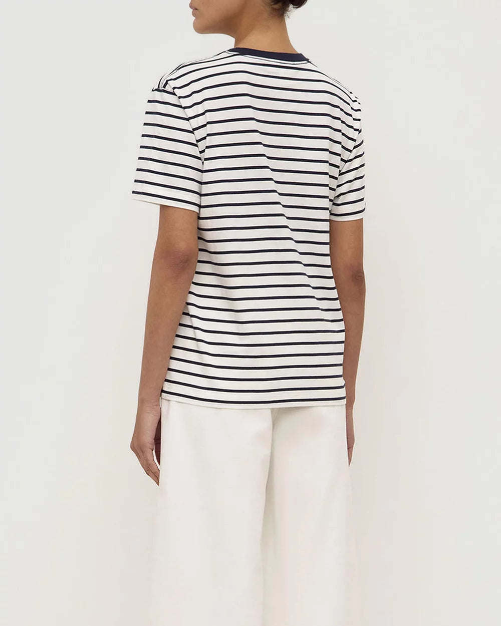 Relaxed fit cotton tee featuring a stripe design and contrast collar detail.