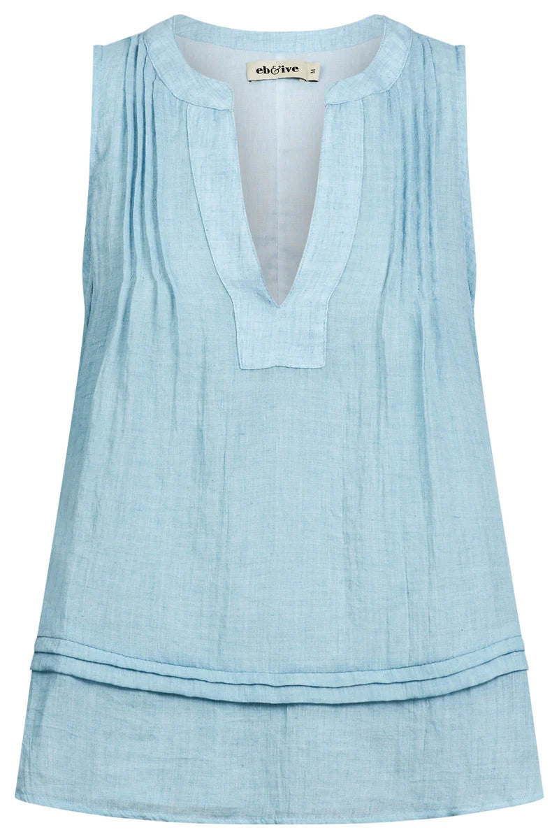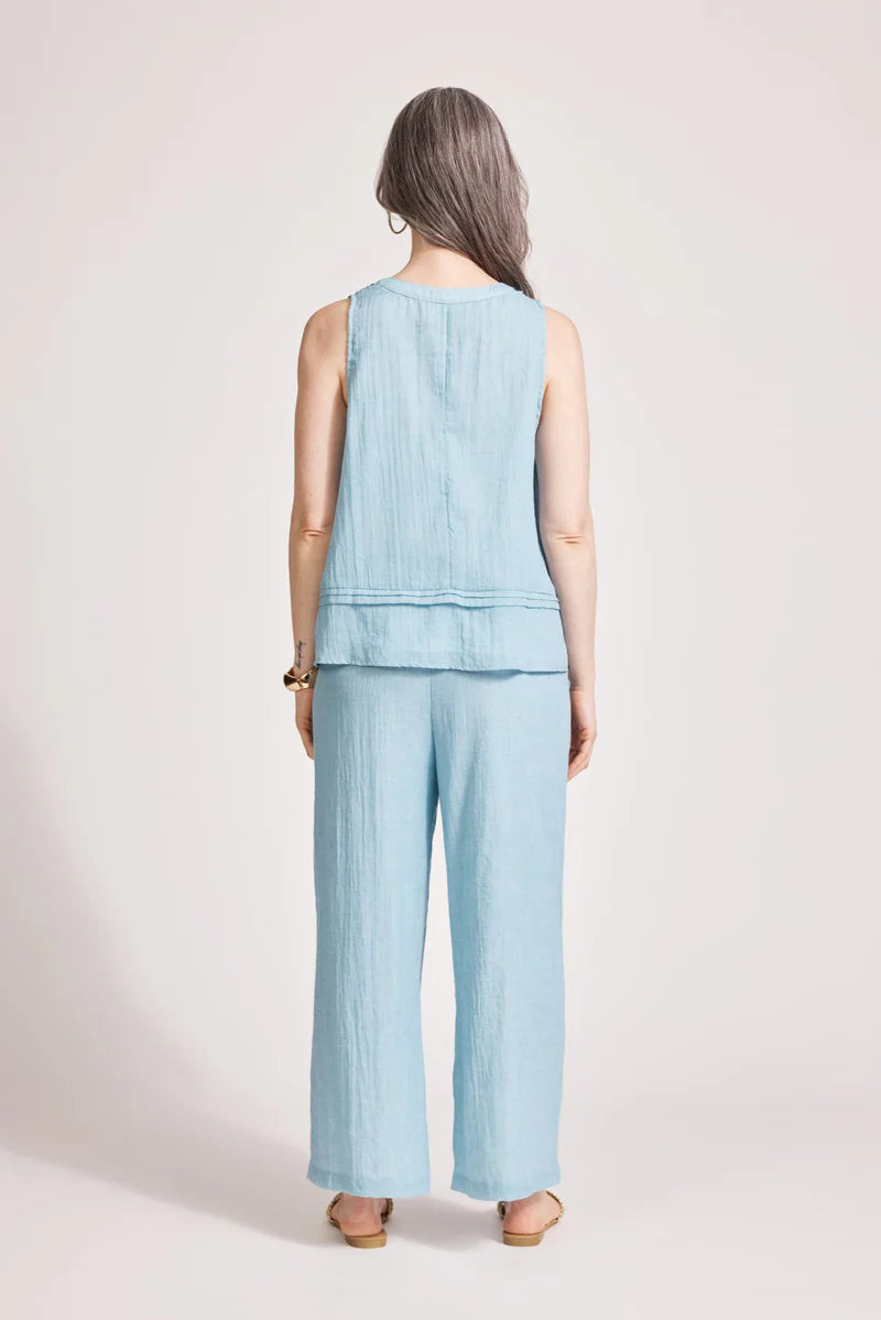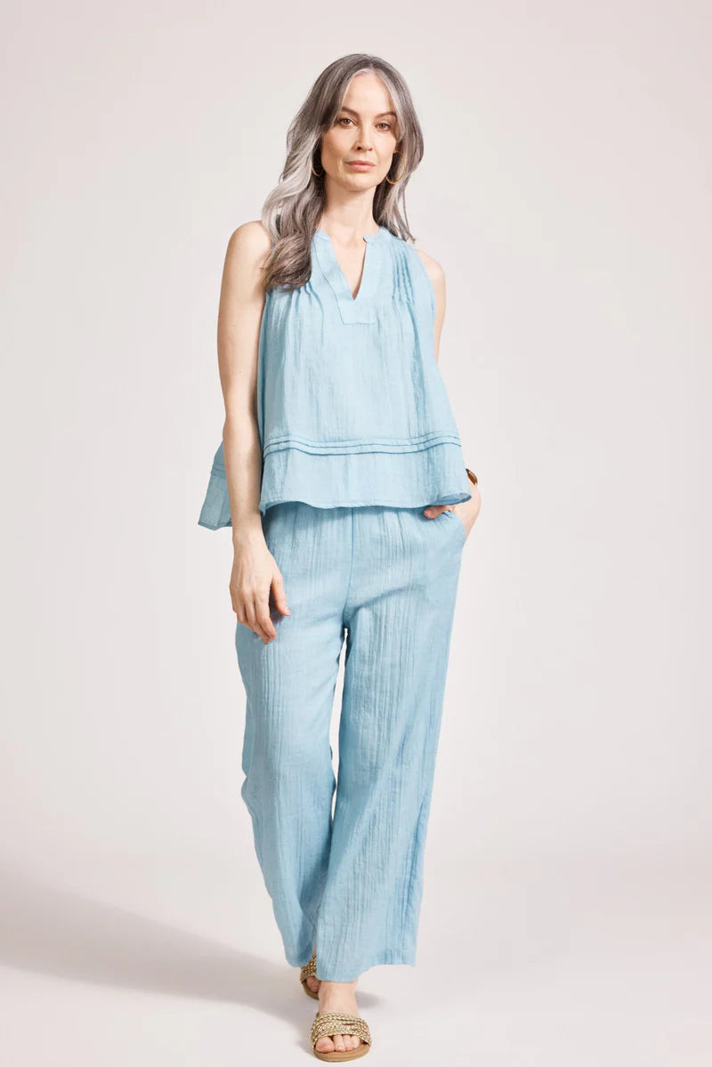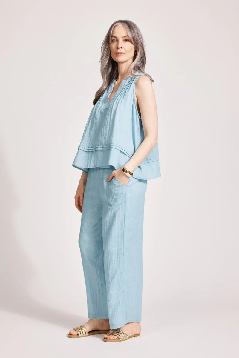 A versatile summer tank with soft texture and natural breathability. Crafted from a cotton-blend with a double-layered design for opacity. Features a flattering V neckline with pintuck detail and soft pleating at the hem.