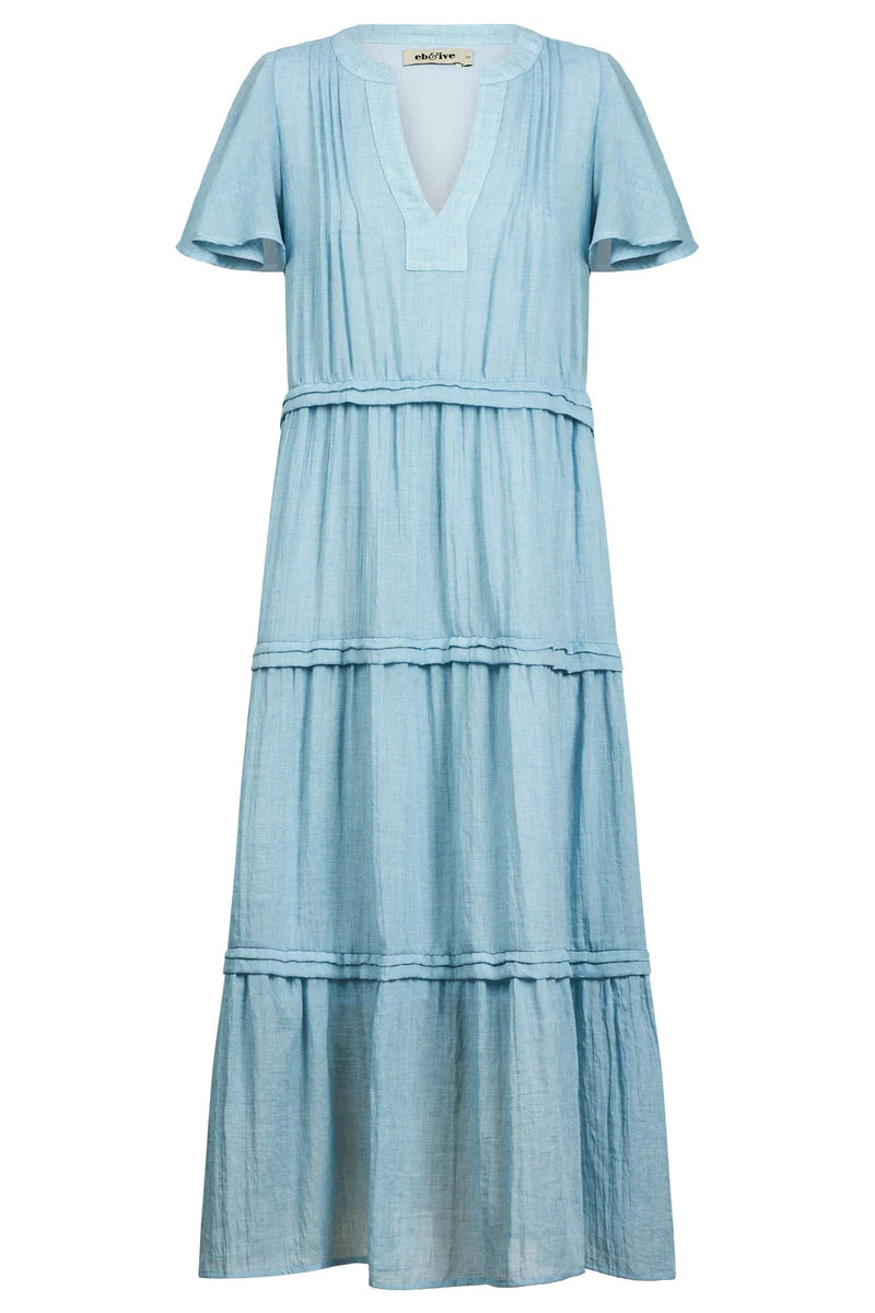 A refined cotton-blend maxi with considered detail. Crafted from textured fabric and double-layered to prevent sheerness. Features a V neckline, soft flutter sleeves, tiered skirt with pleated detailing, and functional side pockets. Designed in a relaxed A-line silhouette.