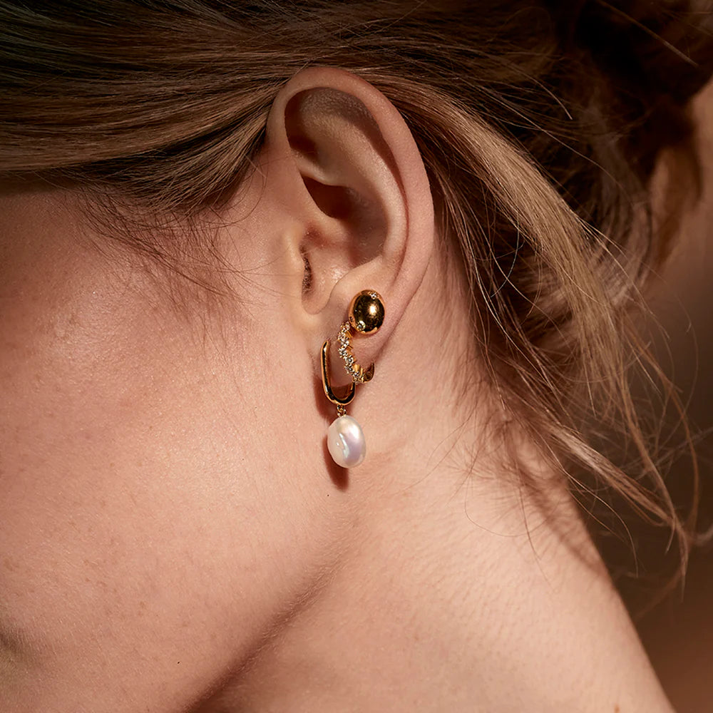 The Eva Pearl Sleepers are a curved rectangle hoop with hanging fresh water pearl. An dainty style perfect for everyday or a special occasion.