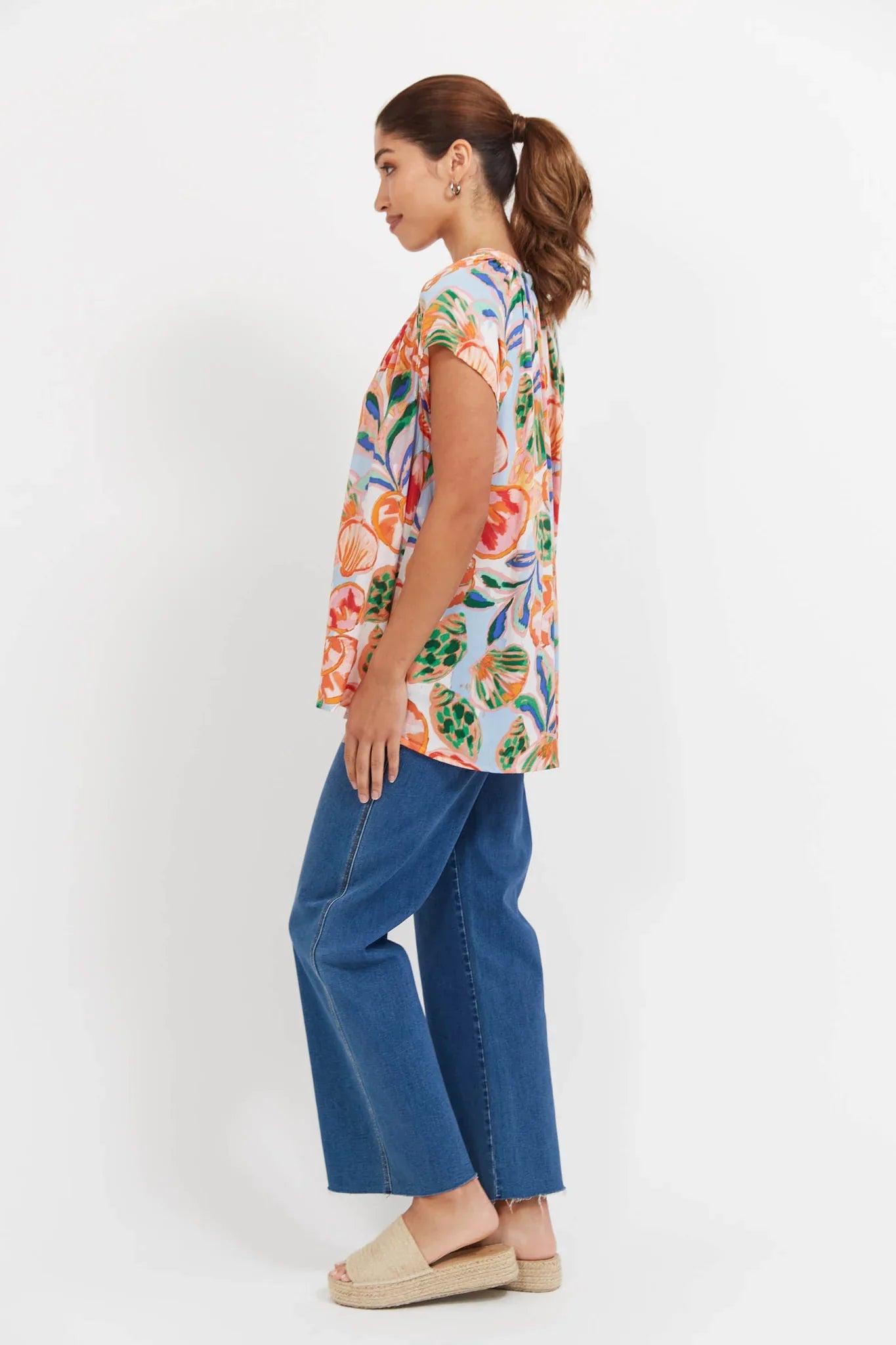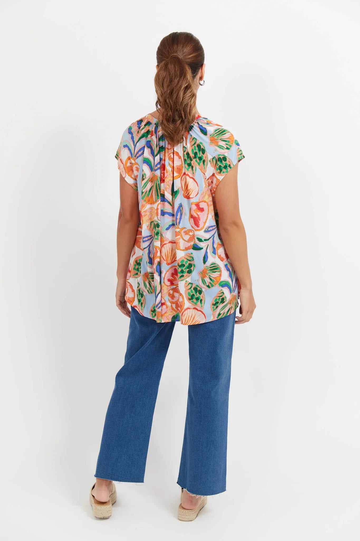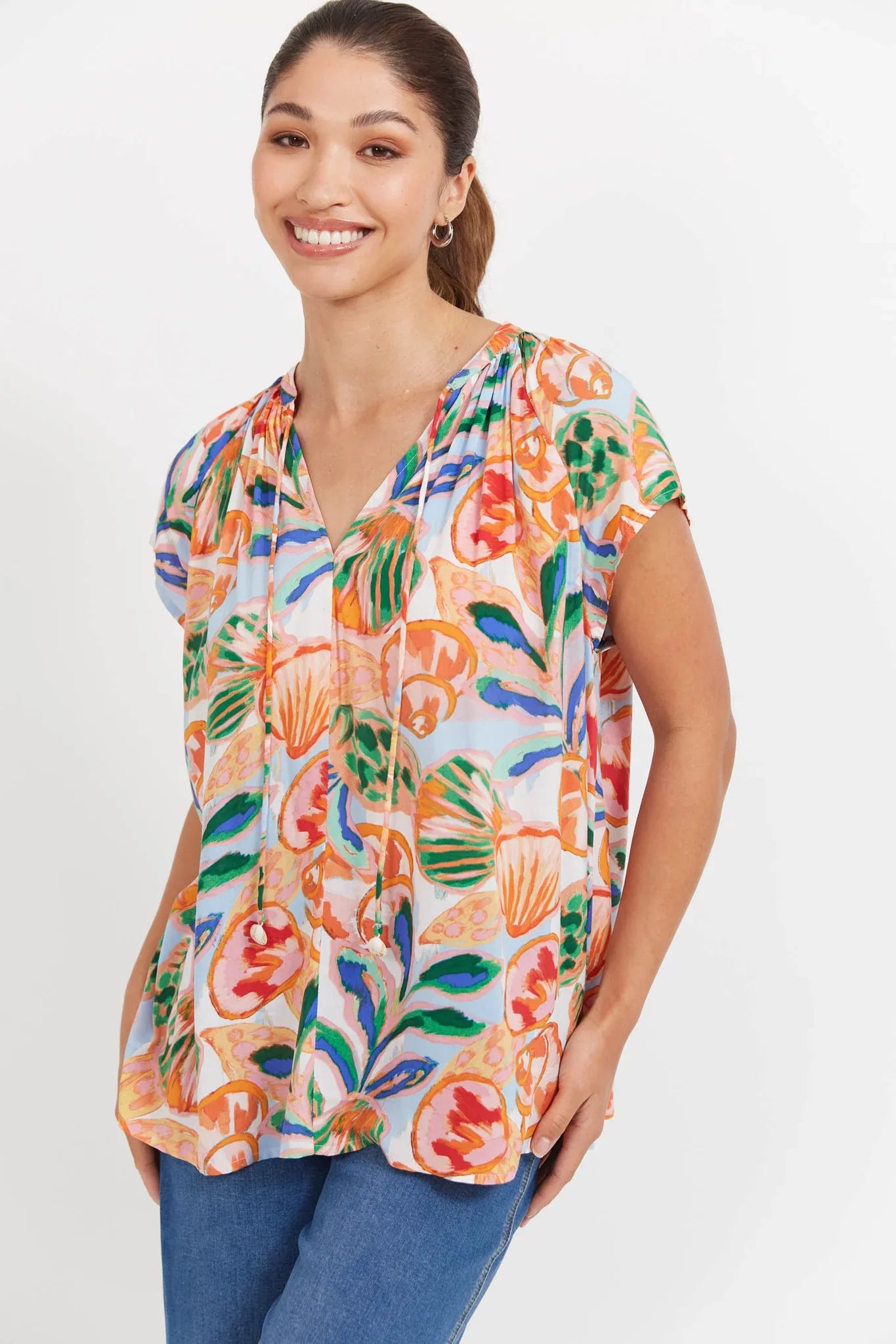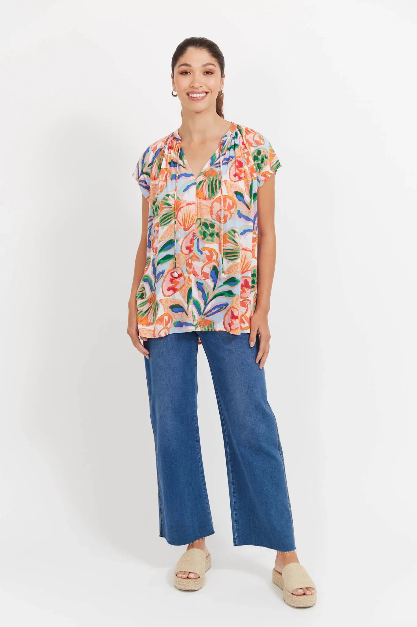 An easy-wear staple with a soft subtle shimmer, the Baja Top is designed for relaxed summer days. Featuring a V-neckline with shell charm-tipped ties, gentle gathering, flutter sleeves, and a swing hem, it offers a flattering, floaty silhouette.