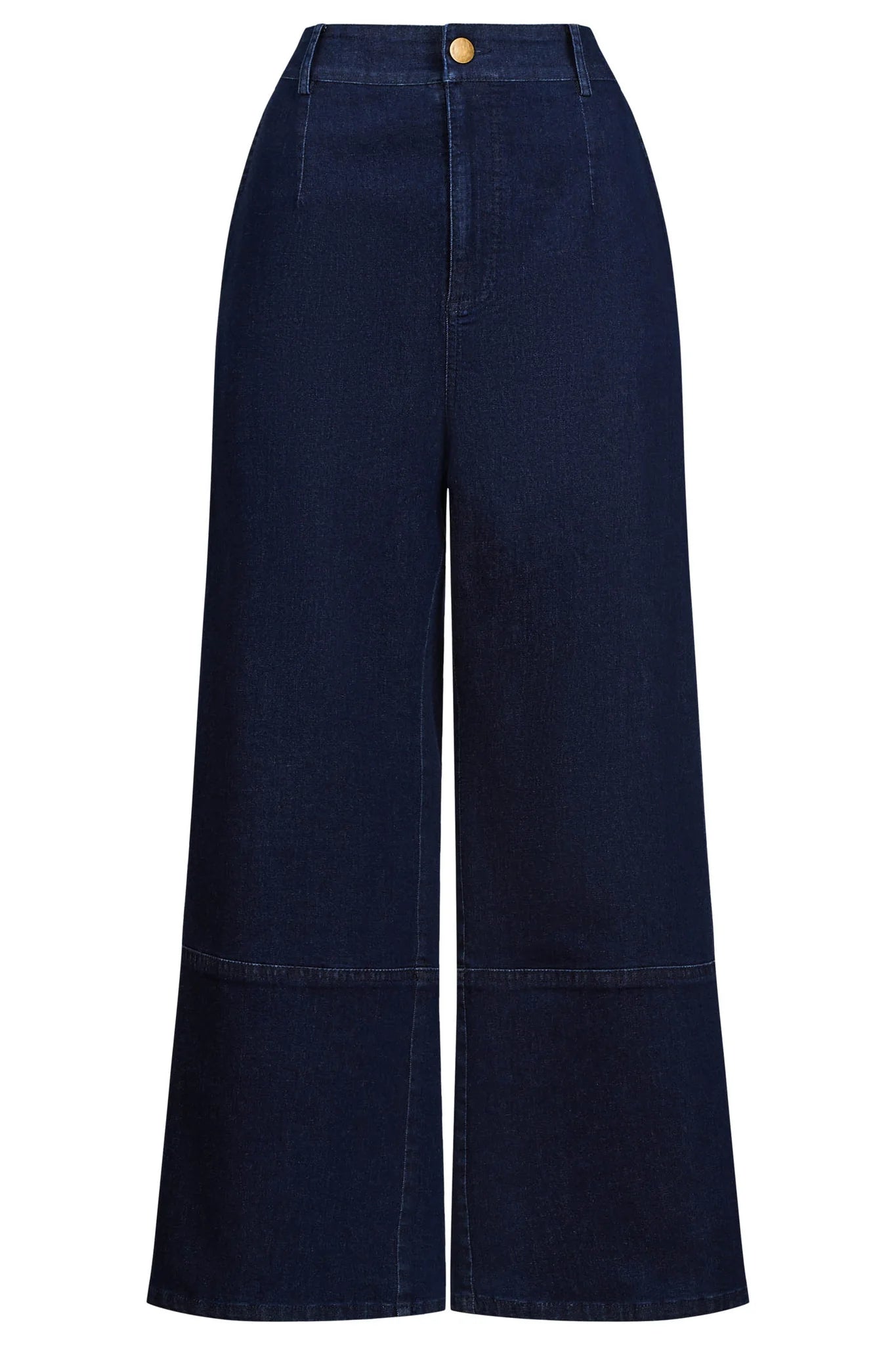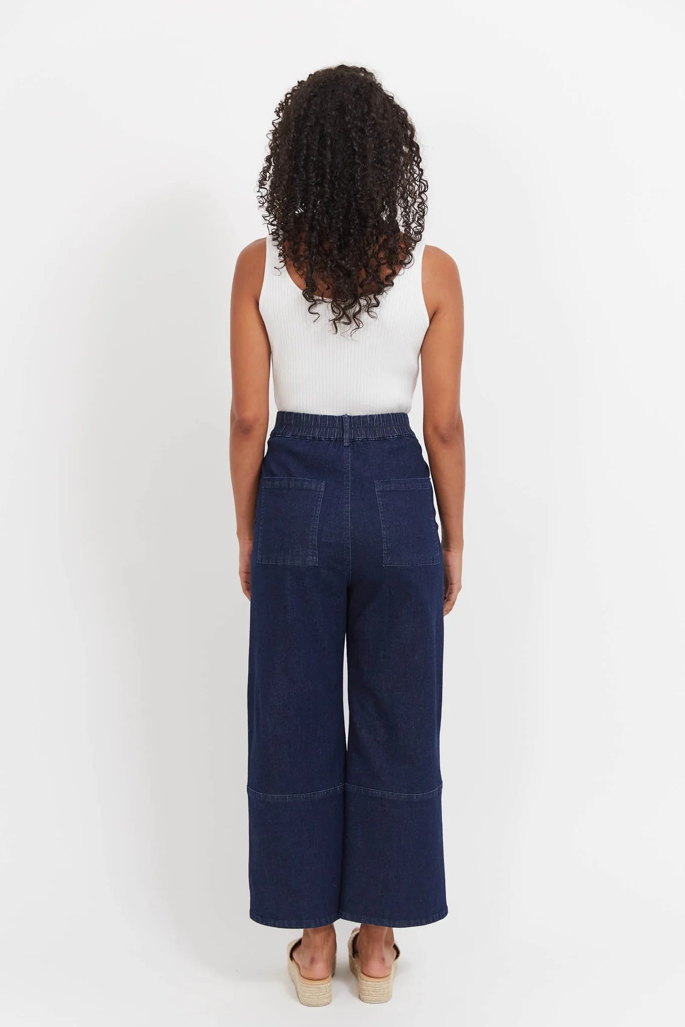 The Panama Pant is crafted from stretch denim for a tailored look that's still comfortable. Designed with a flat front, elasticated back waistband, contrast panel detailing below the knee, and a 7/8-length. Brushed gold hardware and functional side and back pockets complete the look.