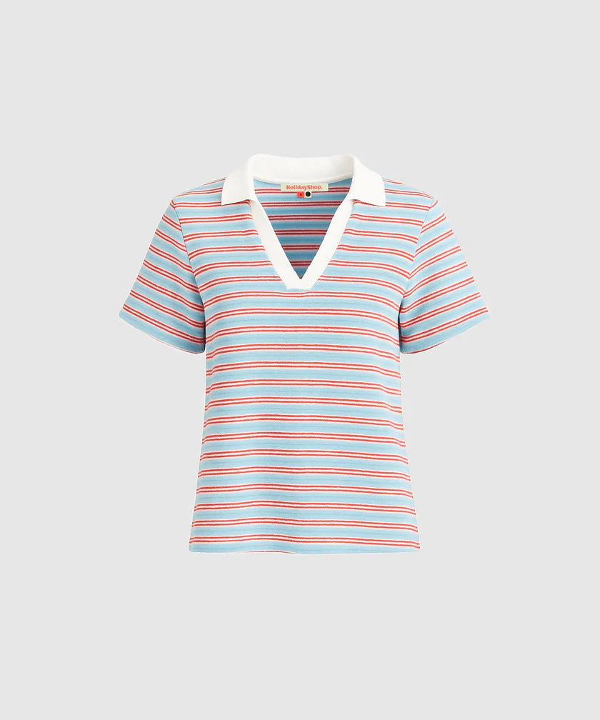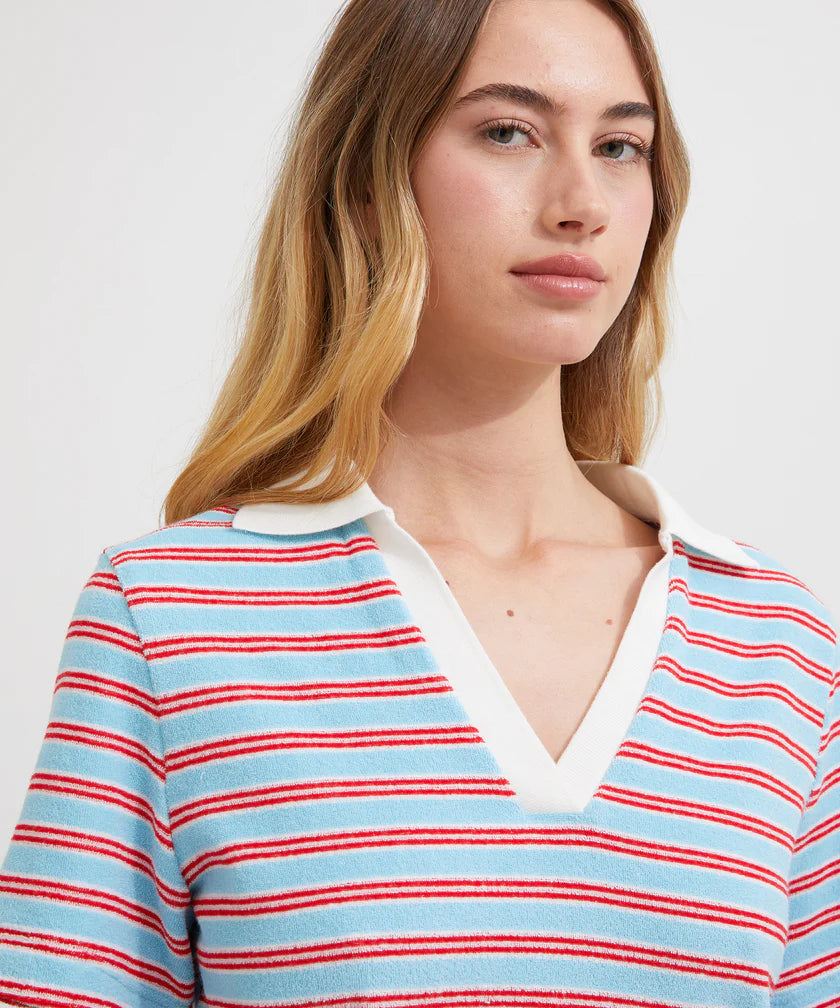 A fun, bold polo top cut from a cotton-blend terry fabrication. The red and blue striped pattern has been contrasted with the ribbed white collar. Designed with a relaxed fit. Wear with the terry shorts for a matching summer outfit.
